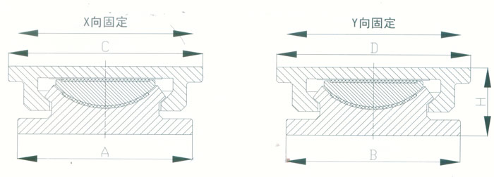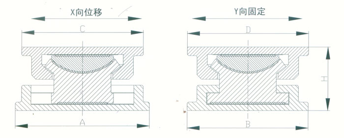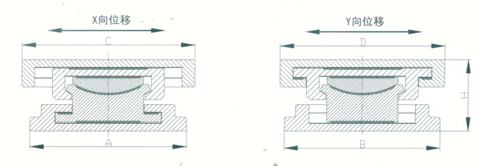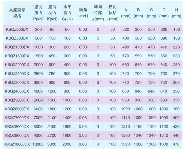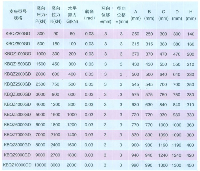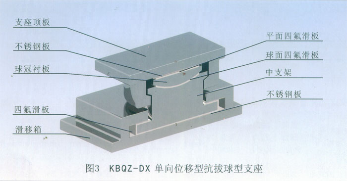 4 KBQZ系列抗拔球型支座 本系列支座主要分為抗拔球型支座和減震抗拔球型支座,下面對其進行分類介紹。4.1抗拔球型支座 此類支座分為固定型、單向位移型和雙向位移型,支座結(jié)構(gòu)如圖3。其主要由支座頂板、不銹鋼板、平面聚四氟乙烯滑板、球冠襯板、球面聚四氟乙烯滑板、中支架、聚四氟乙烯滑板、不銹鋼板和滑移箱組成。支座中的相對滑移部件之間,采用目前世界上摩擦系數(shù)最低的聚四氟乙烯滑板和不銹鋼板相隔,充分減小了摩擦阻力,使各部分之間的運動流暢,避免爬行現(xiàn)象的產(chǎn)生。本類支座通過球面聚四氟乙烯滑板上部構(gòu)件沿著球面相對于下部構(gòu)件的轉(zhuǎn)動實現(xiàn)轉(zhuǎn)角(常用值為0.02rad),在工作過程中支座沿著滑移箱滑道滑動實現(xiàn)水平位移。 豎向壓力的傳遞是通過支座頂板,不銹鋼板,平面聚四氟乙烯滑板,球冠襯板,球面聚四氟乙烯滑板,中支架,聚四氟乙烯滑板,不銹鋼板依次疊加傳至滑移箱底板。 豎向拔力的傳遞是通過支座頂板和中支架的抗拔接觸面將作用于支座頂板上的上.拔力傳至中支架,再由中支架與滑移箱之間的抗拔四氟滑板和不銹鋼板將力傳至滑移箱頂板。 水平力的傳遞是通過支座頂板側(cè)壁與中支架側(cè)壁之間.的接觸面將水平力傳至中支架,再由中支架與滑移箱的接觸面?zhèn)髦粱葡鋫?cè)壁根部。 固定型抗拔球型支座不設(shè)滑移箱。4.1.1普通抗拔雙向位移型球型支座KBQZ-SX普通抗拔雙向位移型球型支座參數(shù)表 表74.1.2普通抗拔單向位移型球型支座KBQZ-DX普通抗拔單向位移型球型支座參數(shù)表 表84.1.3普通抗拔固定型球型支座KBQZ-GD普通抗拔固定型球型支座選用參數(shù)表 表9